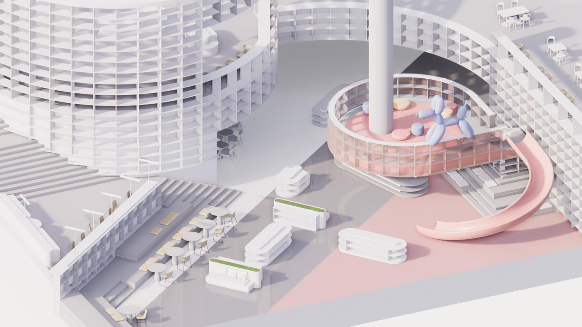 A number of keyspaces were located at the ends of the box-shaped mall, creating uniquely themed atriums on the third, fourth, and sixth floor. Anchor shops such as a gym, children’s education centers, and a cinema occupy opposite ends of the mall, complementing the three atriums. The entire space thus becomes a well-rounded system without cold zones, driving the circulation upwards and around the proposal. Anchor shops such as a gym, children’s education centers, and a cinema occupy opposite ends of the mall, complementing the three atriums. The entire space thus becomes a well-rounded system without cold zones, driving the circulation upwards and around the proposal.