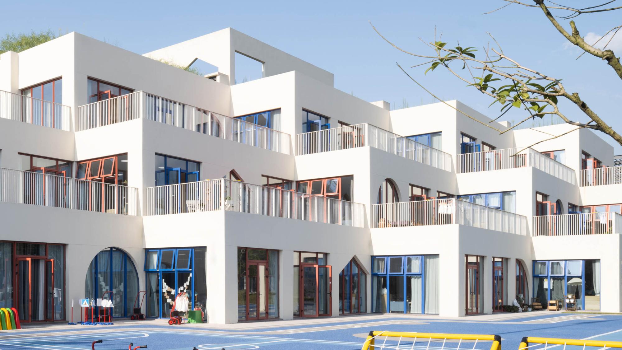 Unlike the majority of colourful kindergarten designs, colour application in this project is extremely restrained. The facades of the buildings are predominantly white, allowing children to be the true protagonists, while the architecture and spaces merely serve as a backdrop for them to express their nature.