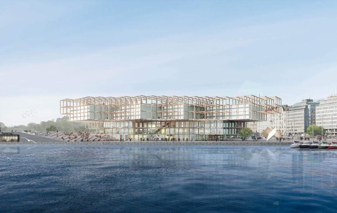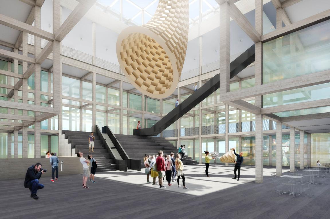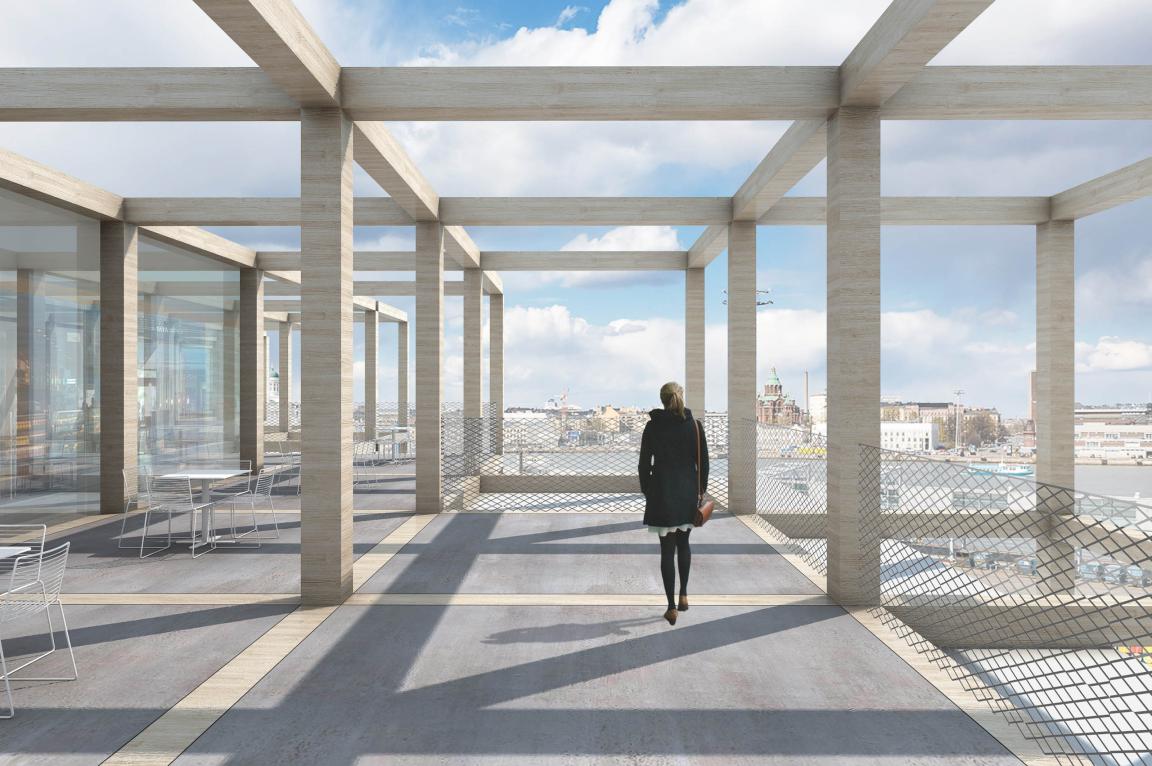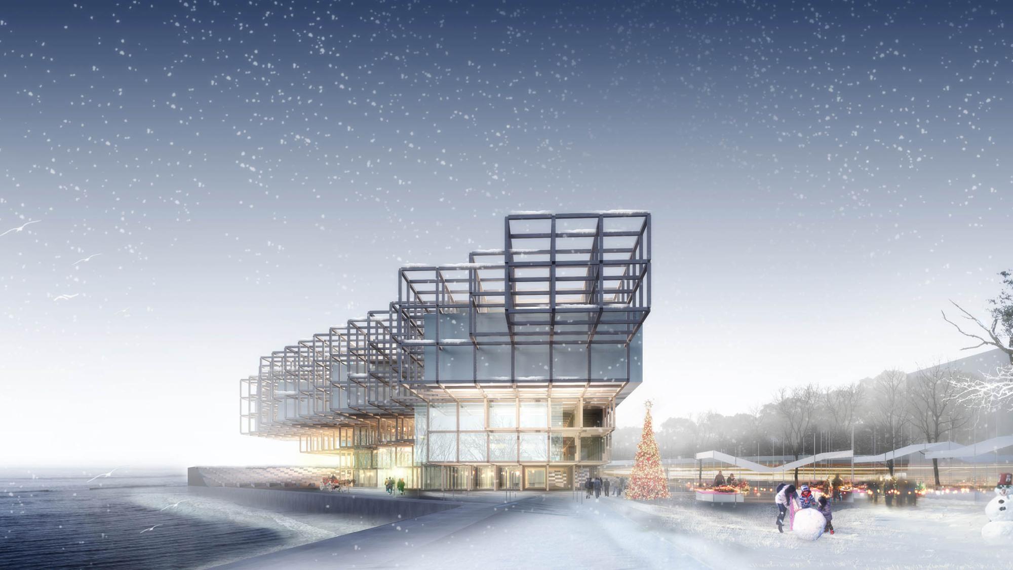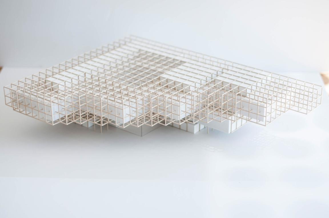This proposal concept aims to function as a translator between the urban condition, the public, and the museum spaces. The existing urban edges of the city context define a triangular building mass. Lifting the main exhibition space allows the public and the museum programme to float freely underneath, creating a continuous connection between the urban fabric and water. A 24-metre high atrium in the raised exhibition space generates a T-shaped hybrid space, combining the qualities of a horizontal exhibition space with those of a vertical one and making three dimensional displays possible. The grid structure (in Finnish wood) shapes diverse spaces – galleries, atrium-like spaces and informal exhibition spaces beyond the physical confines of the building.