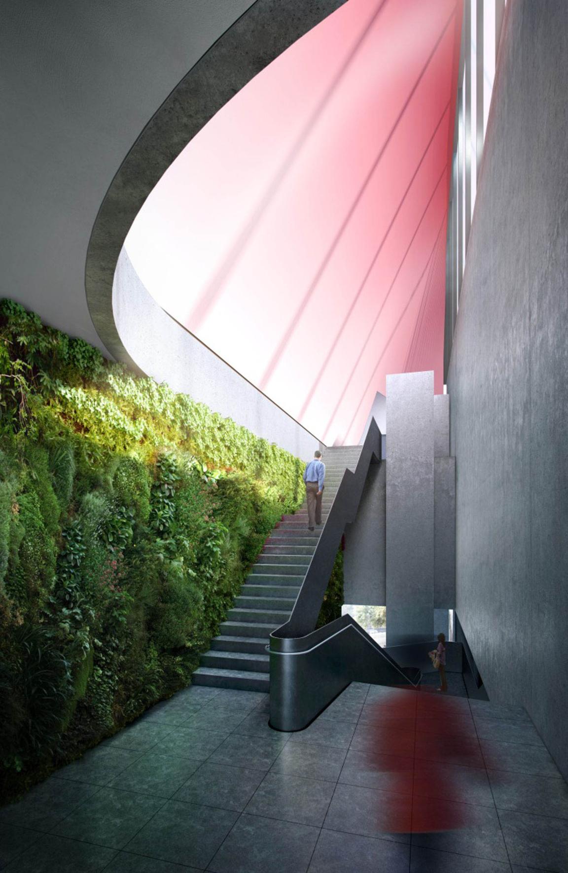 The design introduces a clear contrast between external solidity and interior openness. The exterior expresses a calm, almost monolithic identity, acting as a counterpoint to the light-filled, interconnected interior. A central atrium, punctuated by a shallow reflection pool, creates visual porosity and enhances orientation across the gallery.