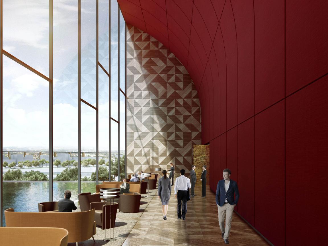 Key to the design are a sequence of rooftop terraces and viewing decks. These elevated platforms offer visitors a panoramic view across the Yangtze River and its natural surroundings. Integrated gardens and outdoor lounges strengthen the building’s civic function, encouraging continuous use beyond its commercial role.