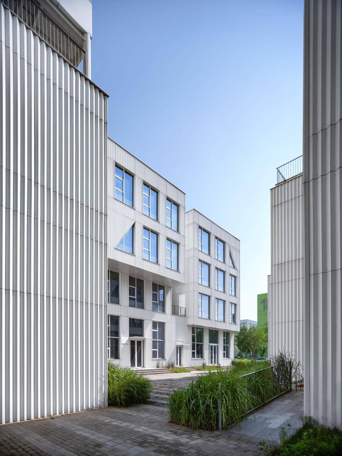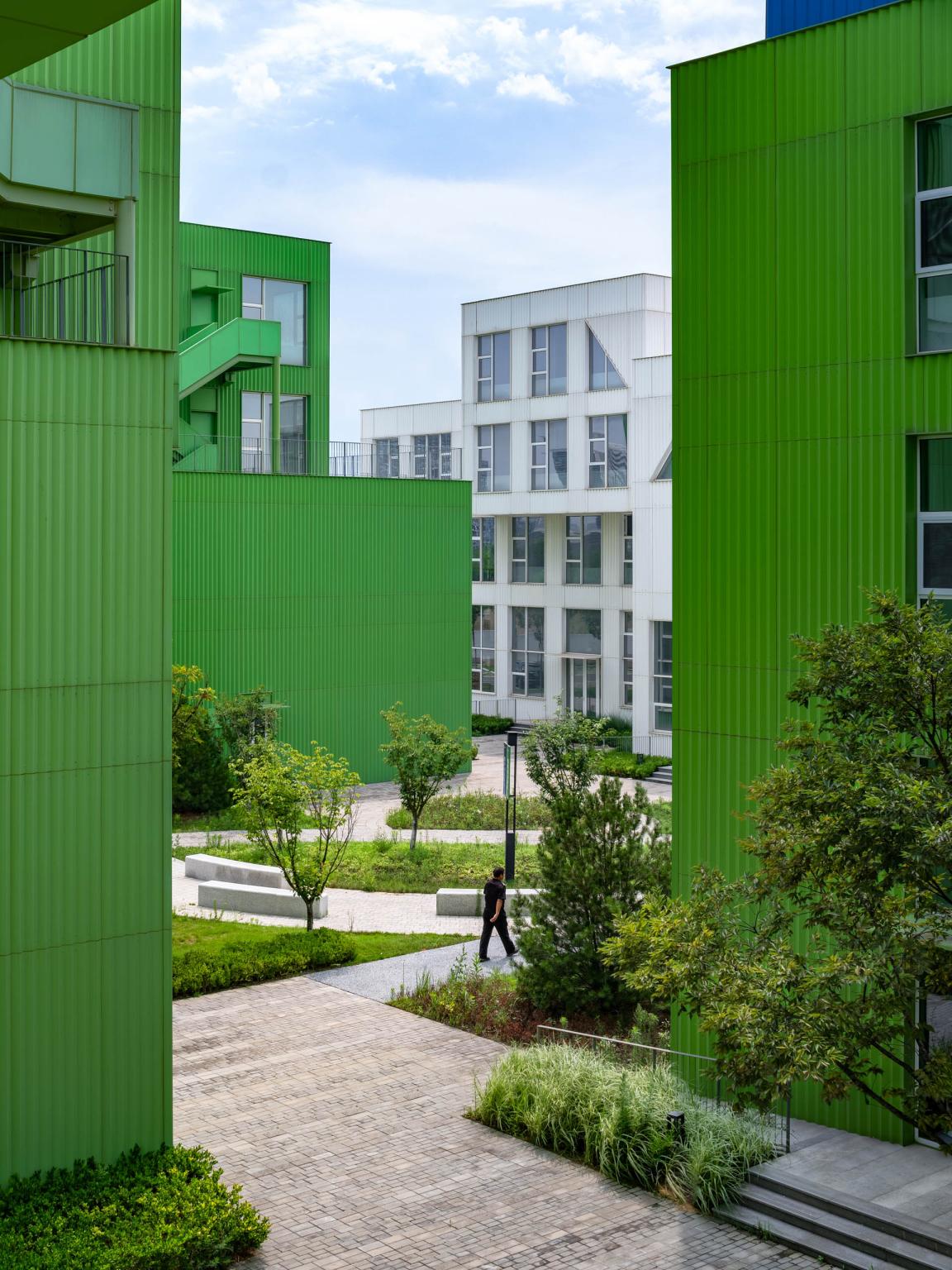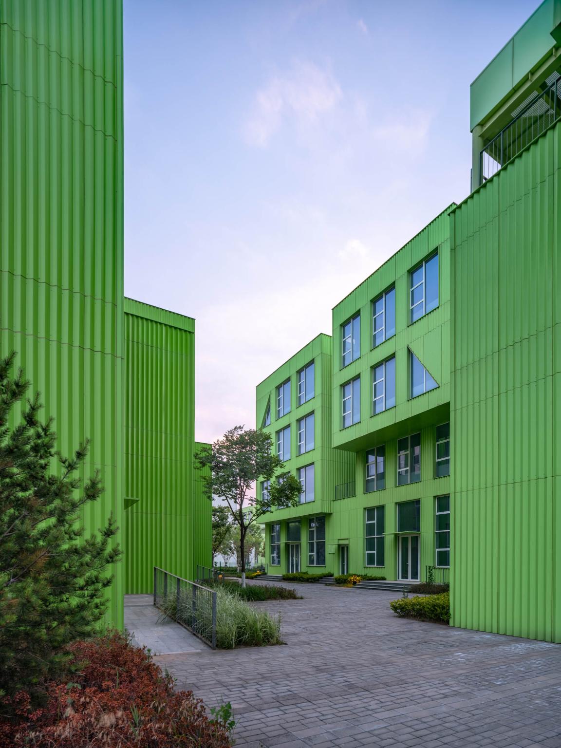 CLOU’s design concept is to break the conventional modular form of the Software Tech Park and tailor each plot to its geographical and functional conditions in adaptive volumetric attributes: small-scale, low-density townhouse office complexes are placed at the northern plots; single-volume buildings of enterprises, 450 to 700㎡in size, are made distinctive by the colors of their corrugated aluminium panel façades on the exterior. The ceiling height of the ground floors measuring 5.6 meters allows for flexible and open spatial arrangement to meet changing needs at different stages for companies in distinct industries, on par with office buildings in world-class centres of technology and industry such as those of Silicon Valley in California and Bangalore in India.