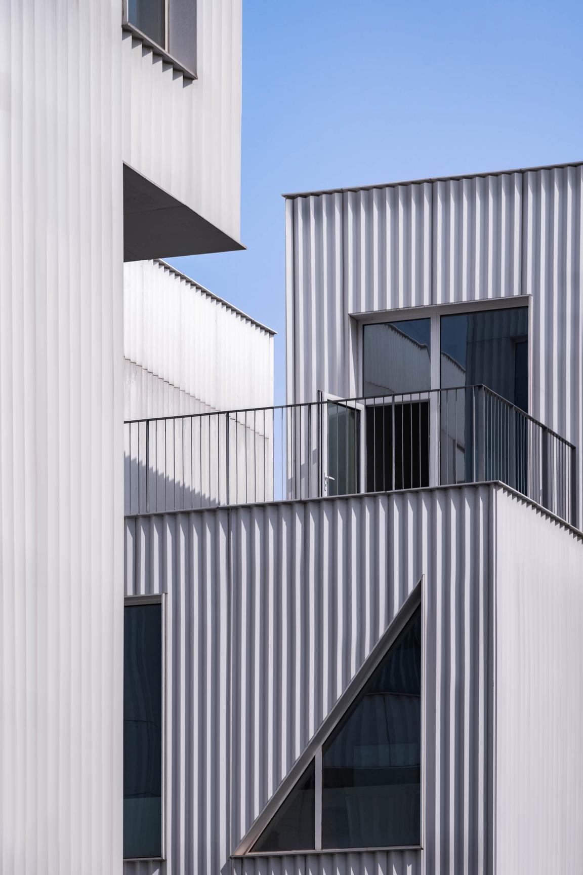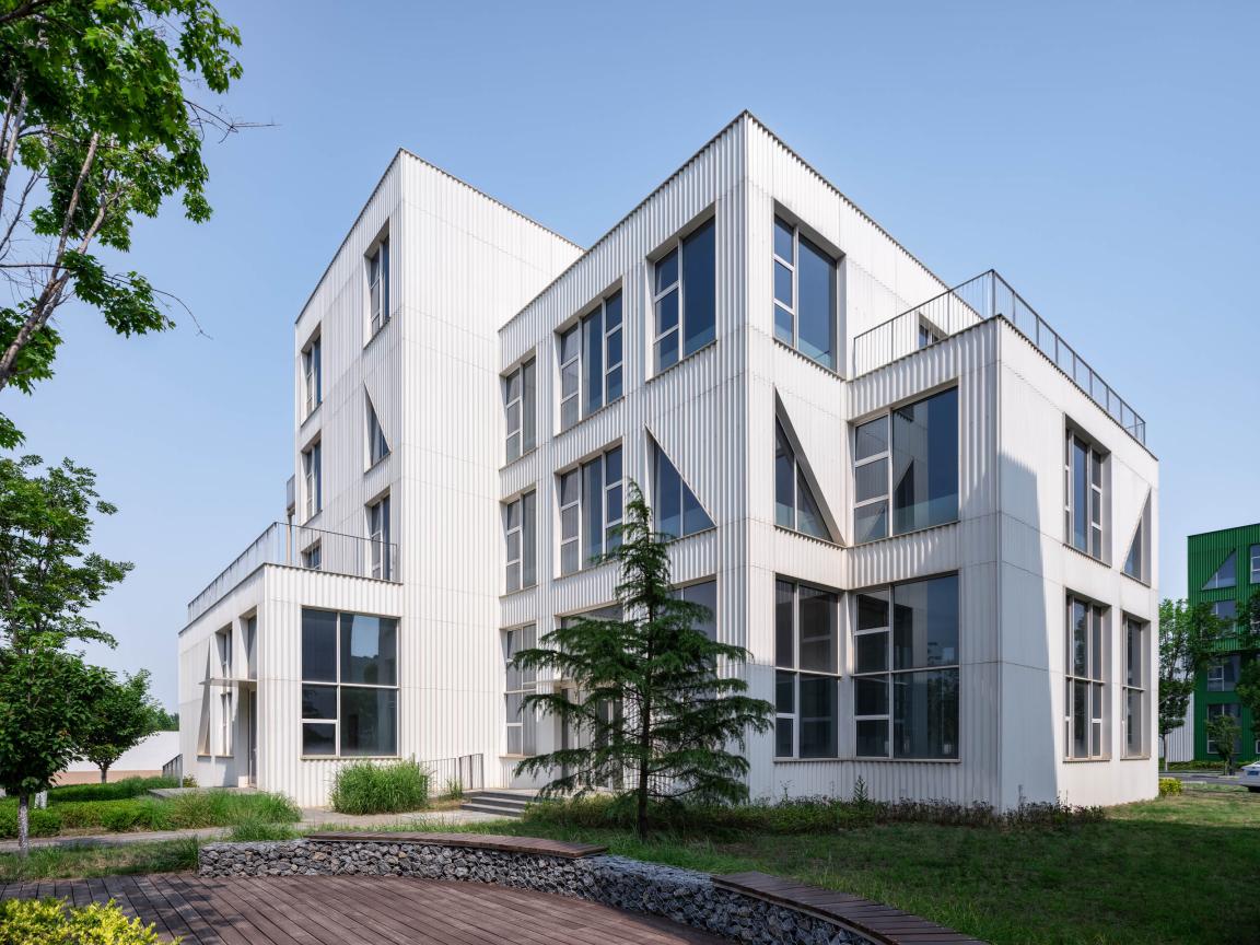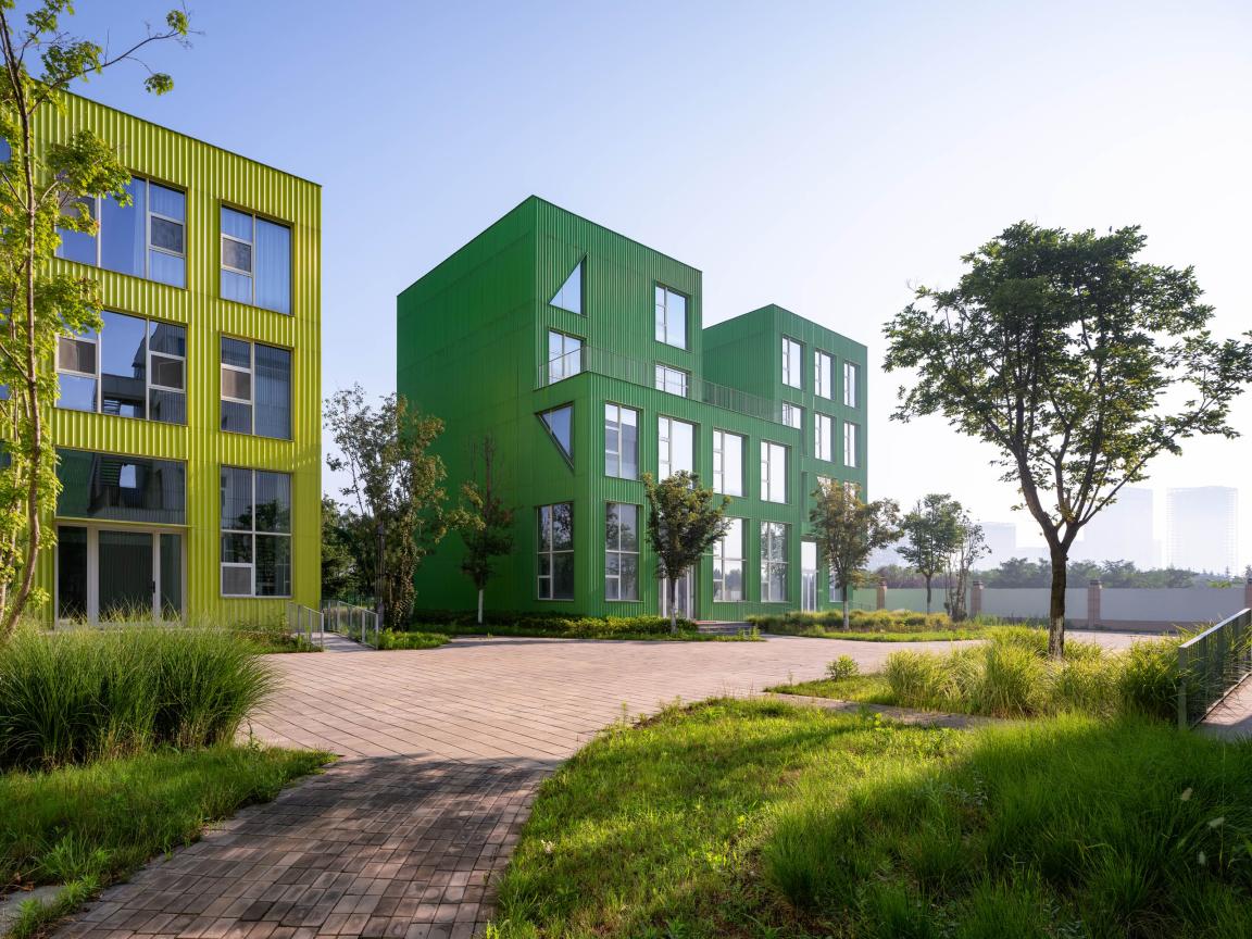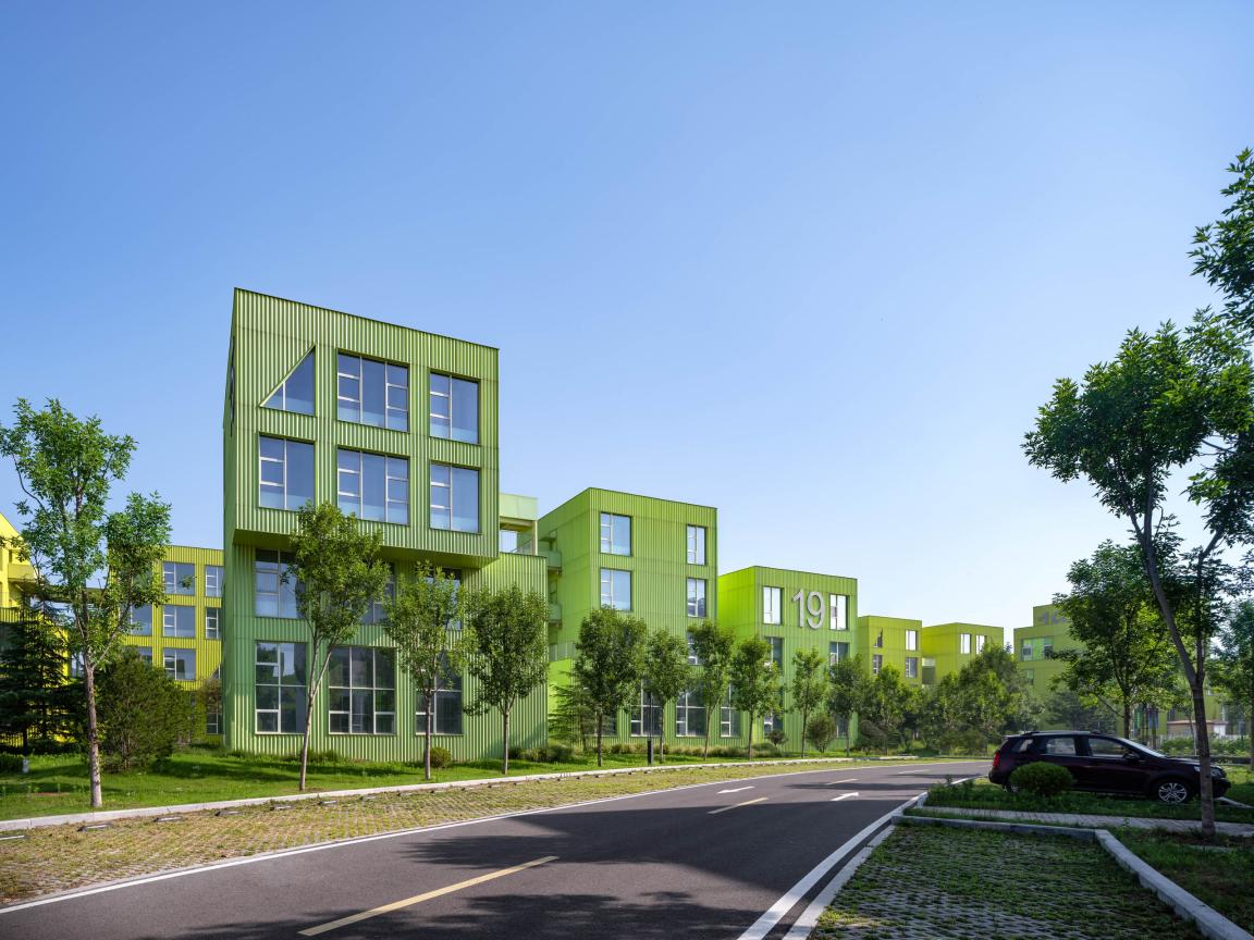 CLOU’s design concept is to break the conventional modular form of the Software Tech Park and tailor each plot to its geographical and functional conditions in adaptive volumetric attributes: small-scale, low-density townhouse office complexes are placed at the northern plots; single-volume buildings of enterprises, 450 to 700㎡in size, are made distinctive by the colors of their corrugated aluminium panel façades on the exterior. The ceiling height of the ground floors measuring 5.6 meters allows for flexible and open spatial arrangement to meet changing needs at different stages for companies in distinct industries, on par with office buildings in world-class centres of technology and industry such as those of Silicon Valley in California and Bangalore in India.