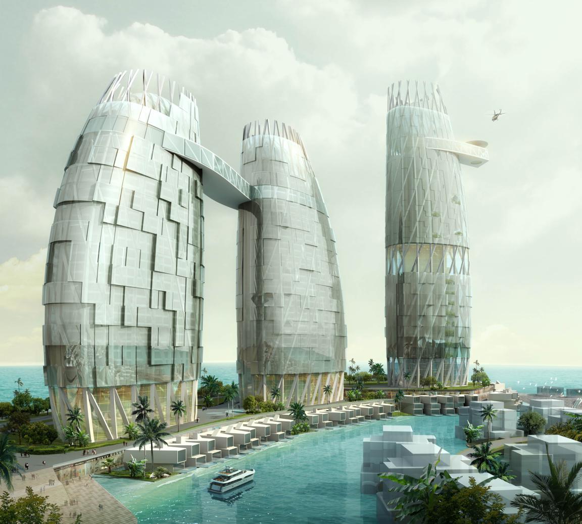 The layout responds to the site’s linear coastal geometry. Towers are positioned at the tip of the site to maximise sea views, while the curved retail volume anchors the entrance from the main road. Open green spaces and water channels weave throughout, enhancing walkability and view corridors.